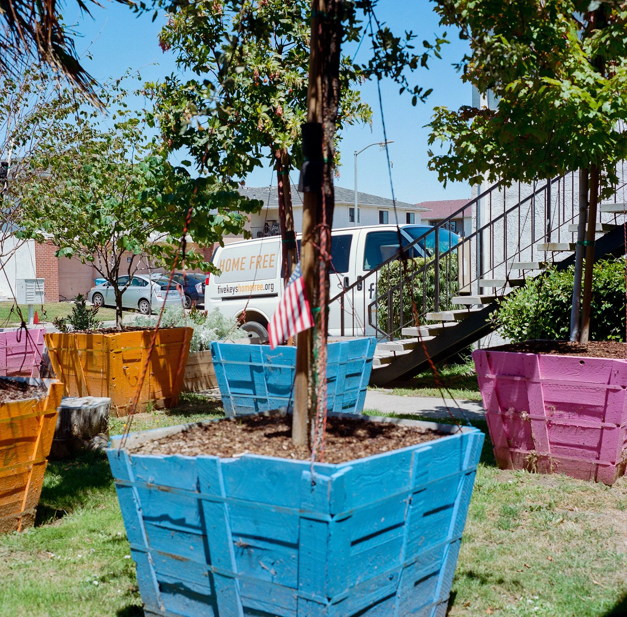 Pink, blue, and orange planter boxes at the building’s entrance each have different trees growing to represent the diverse and unique women who will come through Home Free’s doors. Lizzy Myers