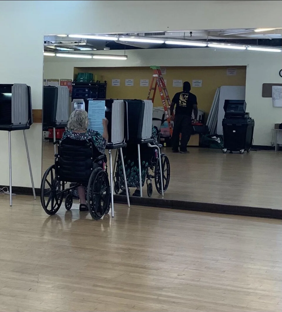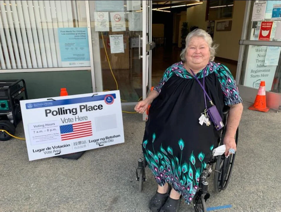 “I was determined to put the ballot in the box myself and ripped up my mail-in ballot because I wasn’t going to take any chances with that,” she says. “I just revved up my buggy (electric wheelchair) and was going to head over. But Home Free leadership, Dorick Scarpelli, insisted he would drive me, so in the end I took him up on the offer.”
